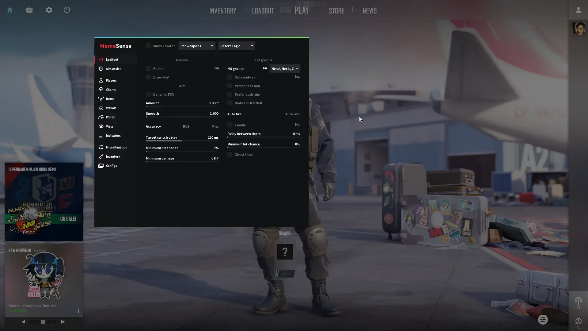 Feature-rich internal CS2 cheat from memesense with deep legitbot tuning, polished visuals, world control, and expansive inventory customization.